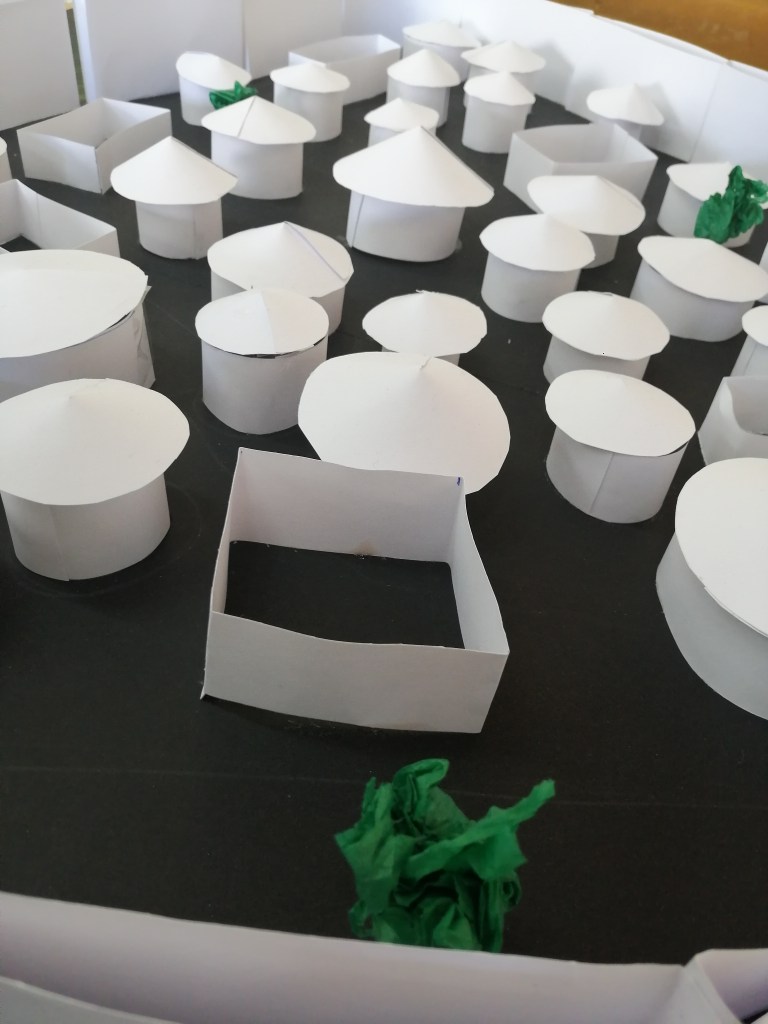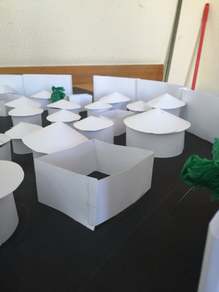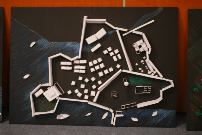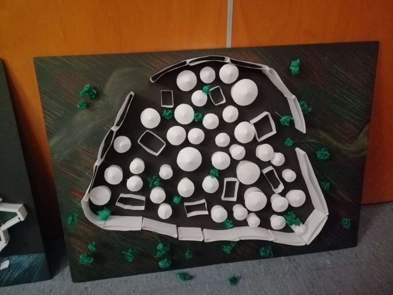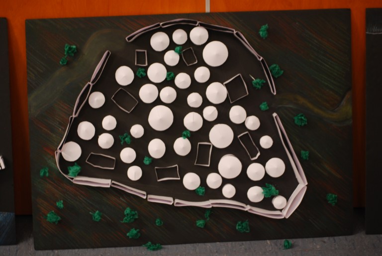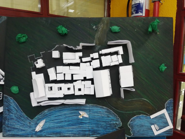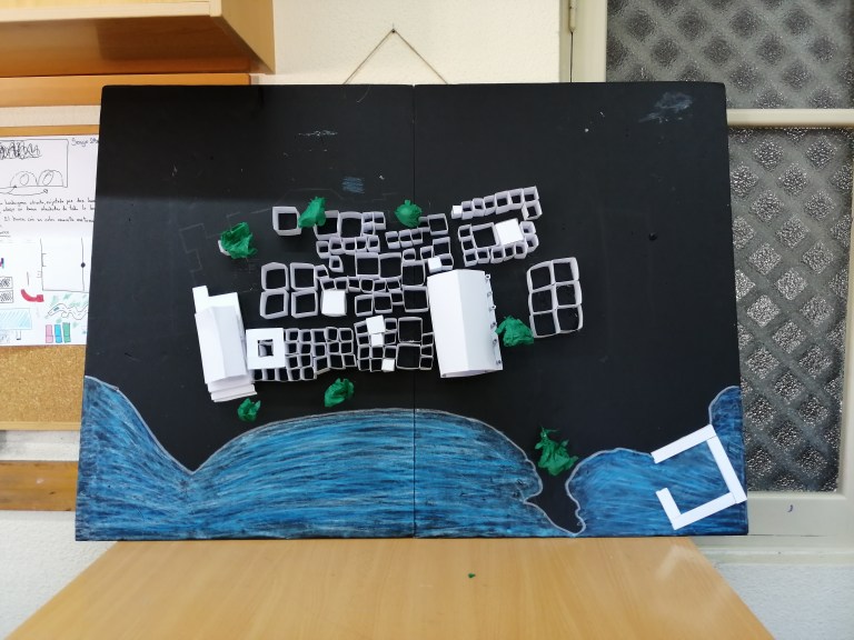 Cuando la investigación doble iba dando sus primeros frutos se pintó la huella de las ciudades en cartón pluma negro y cada grupo cooperativo empezaba a trabajar en su sector o área de estudio y construía de forma conceptual los edificios de dicho ámbito. Una vez que las ciudades se construyeron, se mejoraba el diseño con árboles o se pintaba el mar.